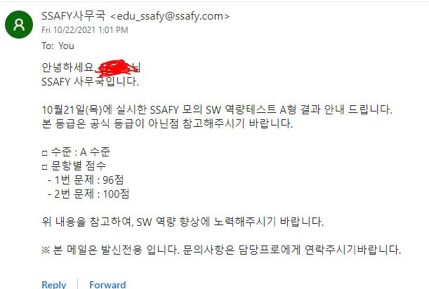 목표였던 삼성 모의 A+형 소프트웨어 역량평가에 통과했다. 총 2회 시험을 봤고, 2회 시험 중 한 문제는 감독관님과 소통 오류가 있어서 100점 만점에 96점을 받았다. 소통만 잘 되었으면 내 코드를 지우고 정해를 작성할 수 있었을텐데 그렇게 하지 못해서 정말 아쉬웠다.