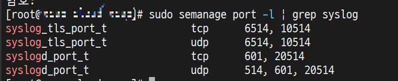 sudo semanage port -a -t syslogd_port_t -p tcp 1514 # TCP 1514 포트 열기 sudo semanage port -l | grep syslog # 포트 목록 확인.