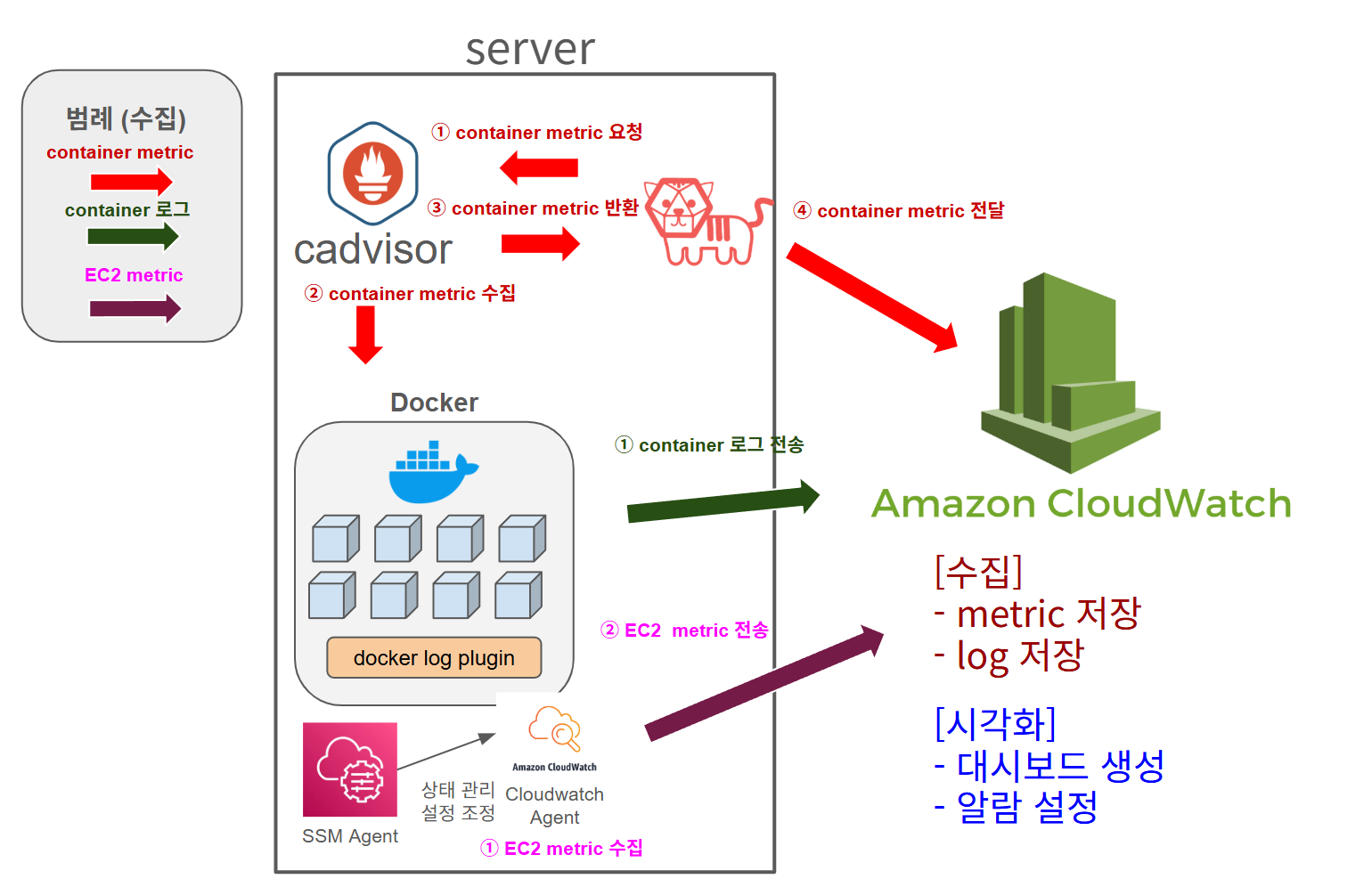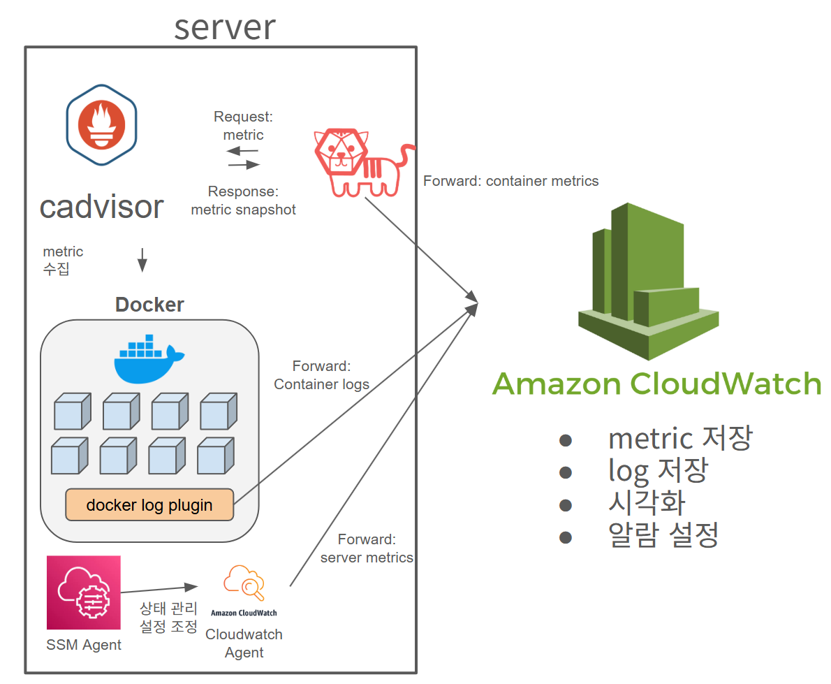 - SSM Agent - EC2(VM)에 설치됨. 사용자가 AWS Dashboard 내에서 Cloudwatch Agent 설정을 변경할 수 있게 함.